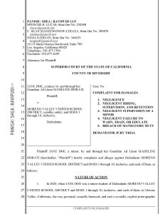 PSR attorneys Spencer Lucas, U. Sean Maneewongwathana, and Neda Saghafi have filed a civil lawsuit against Moreno Valley Unified School District (“MVUSD”) on behalf of Jane Doe, a minor, arising out of alleged sexual abuse by a campus supervising officer at Canyon Springs High School and systemic failures by the District.